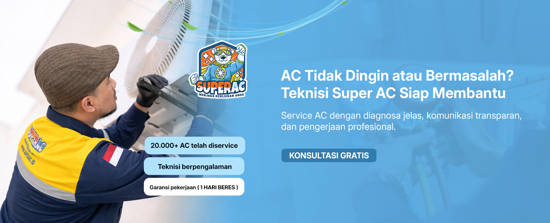 Jasa perbaikan AC dari Super AC siap menangani berbagai masalah pada AC seperti tidak dingin..